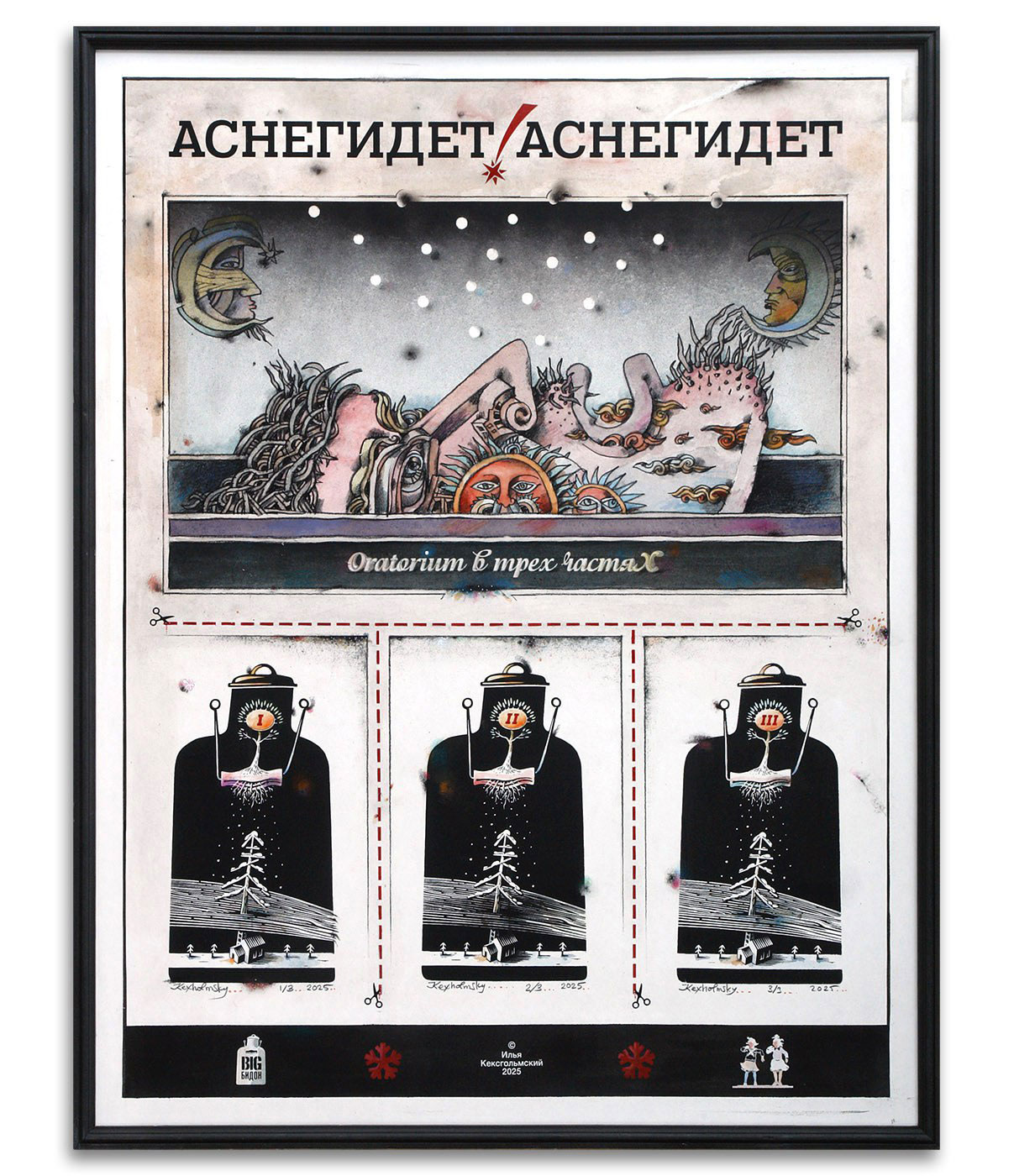 Фраза «аснегидет», заимствованная из стихотворения Евгения Евтушенко, сведённая в одно слово и лишённая паузы, превращается в формулу этого состояния. В контексте выставки «Новогодний набор» работа отзывается на ожидание начала нового времени. Но новогодний снег не обещает обновления — он просто идёт. И в этом бесконечном «между» время длится, не предлагая ответа: а снег идёт, а снег идёт, и всё вокруг чего-то ждёт…"