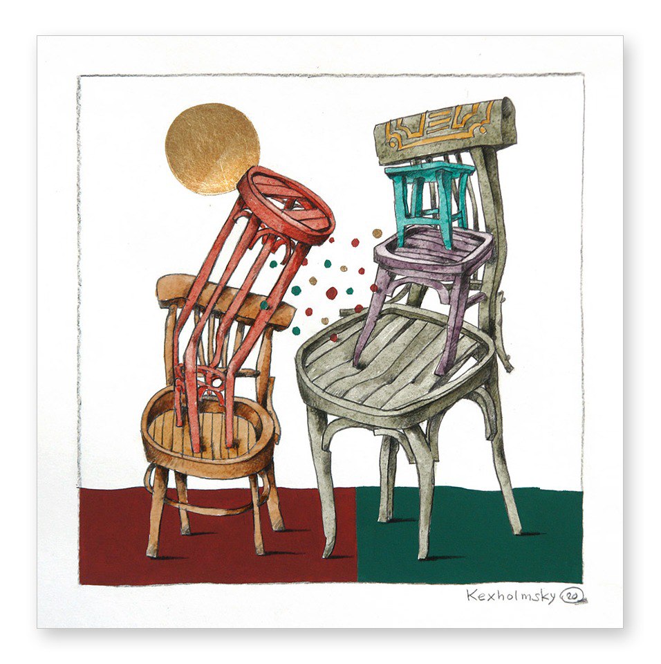 Не помню уже с какого бока здесь Пелевин, но называется композиция "Непобедимое солнце" Бумага, графит, акрил, поталь. 48 х 48 см, 2020. В частной коллекции.